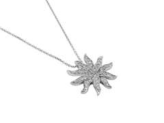 Pirlanta tasli günes kolye, 2 cm çapinda olup, 45 adet pirlanta ile süslenmistir.