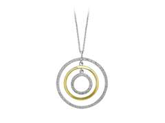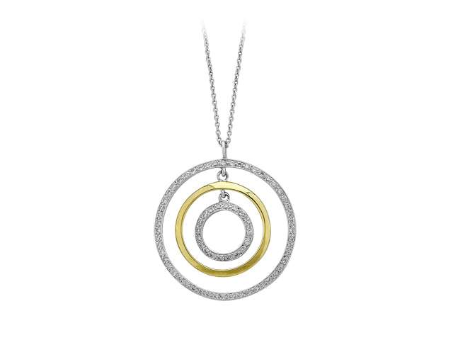 Pirlanta tasli yuvarlak kolyenin en büyük halkasinin çapi 3 cm'dir. 3 halkadan olusan kolye esnek ve sallana bilen bir modeldir. Ortadaki sari altin kismi tassiz, diger halkalar pirlanta taslidir.