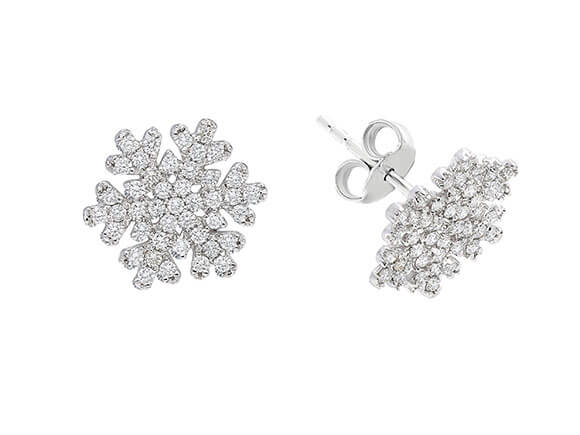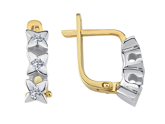 Halka küpe seklinde olup, üstteki çiçek motifi dönecek sekilde esnek olarak tasarlanmistir. 18 ayar altin ve 44 adet yuvarlak kesim pirlanta tas kullanilmistir.