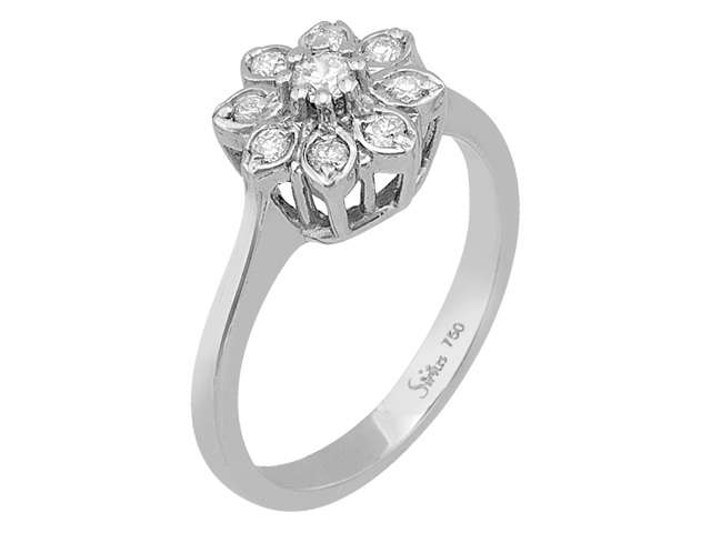 Pirlanta tasli yüzügün çiçek kismi yüksekte durmaktadir ve 1,1 cm çapindadir. Markiz seklinde yapraklari olan bir çiçege benzemektedir. Toplam 9 adet yuvarlak kesim pirlanta kullanilmistir.