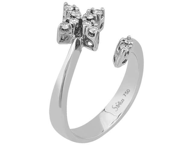 Pirlanta tasli yüzük modelinin genisligi 1,6 cm olup, büyük motifinin çapi 1 cm'dir. Iki kolu birbirinden ayri kalacak sekilde modern bir tasarima sahiptir. 18 ayar beyaz altin üzerine toplam 10 adet pirlanta islenmistir.