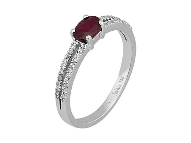 Pirlanta ve yakut tasli yüzük modelinde, yakut tasinin boyu 4 mm olup, eni 6 mm'dir. Sade tasarimli, yakut ve pirlantanin bulustugu bir yüzüktür. Bir adet oval yakut tasinin yani sira 40 adet yuvarlak kesim pirlanta, beyaz altin üzerine islenmistir.