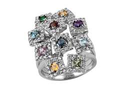120 adet pirlantanin yaninda; mavi topaz, pembe safir, sari safir, yesil safir, akuamarin, ametist, sitrin, savorit, garnet ve mavi safir taslari kullanilmistir. Büyük ve agir bir yüzüktür.